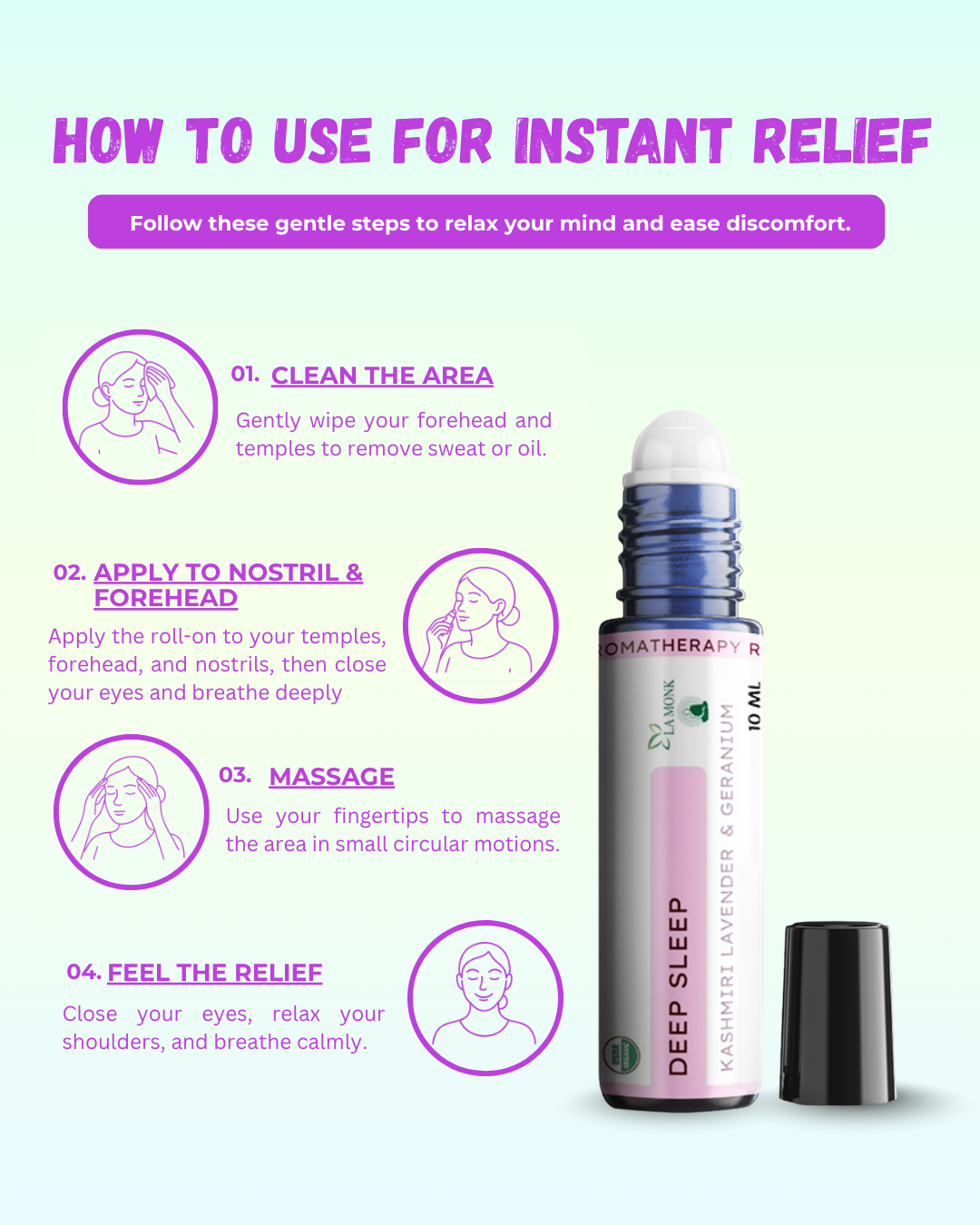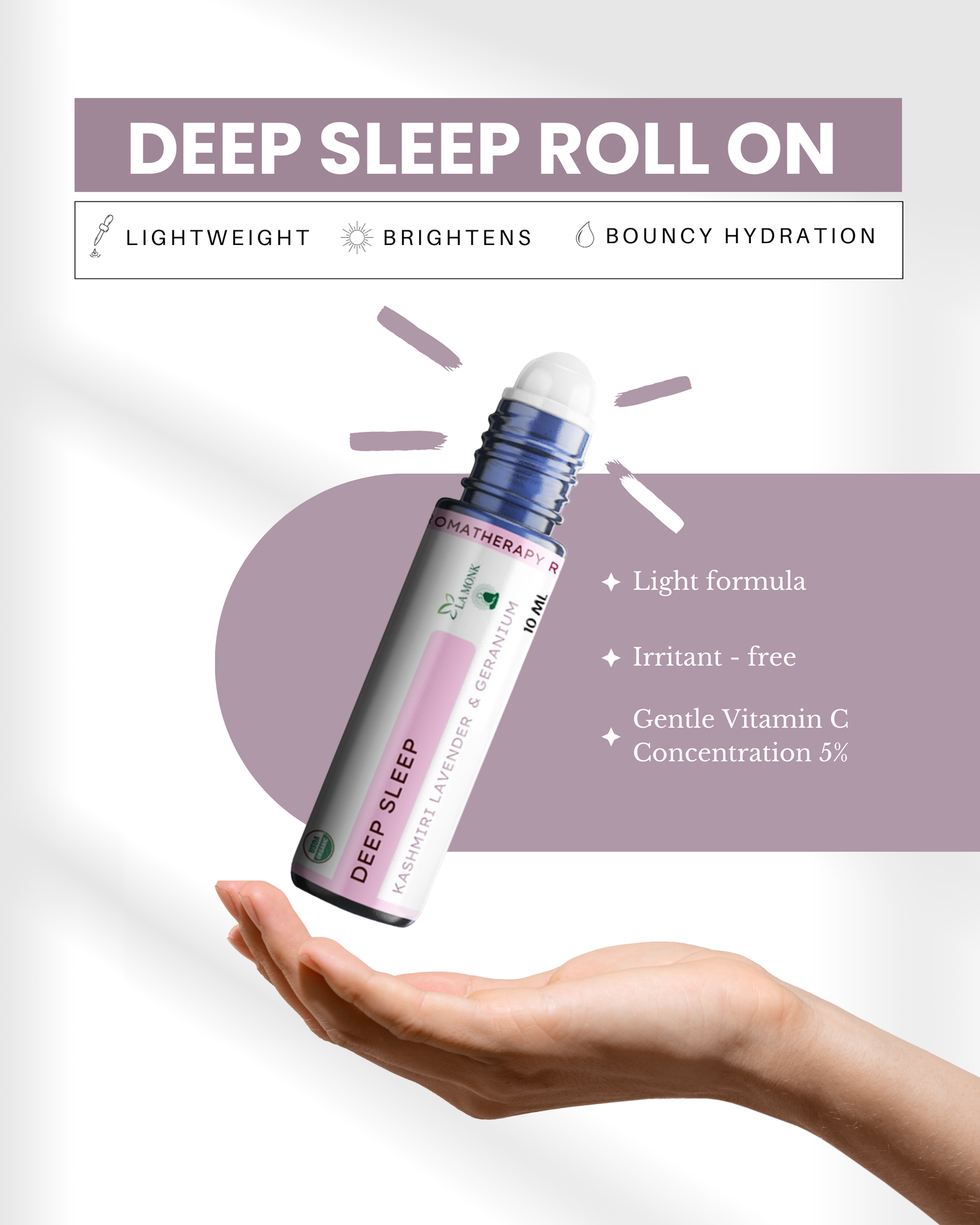 LA MONK Deep Sleep Aromatherapy Roll-On helps you relax and sleep better. It has lavender, chamomile, and sandalwood that calm your mind. Use it before bedtime by rolling it on your skin. It helps you feel peaceful, calm, and ready for sleep.