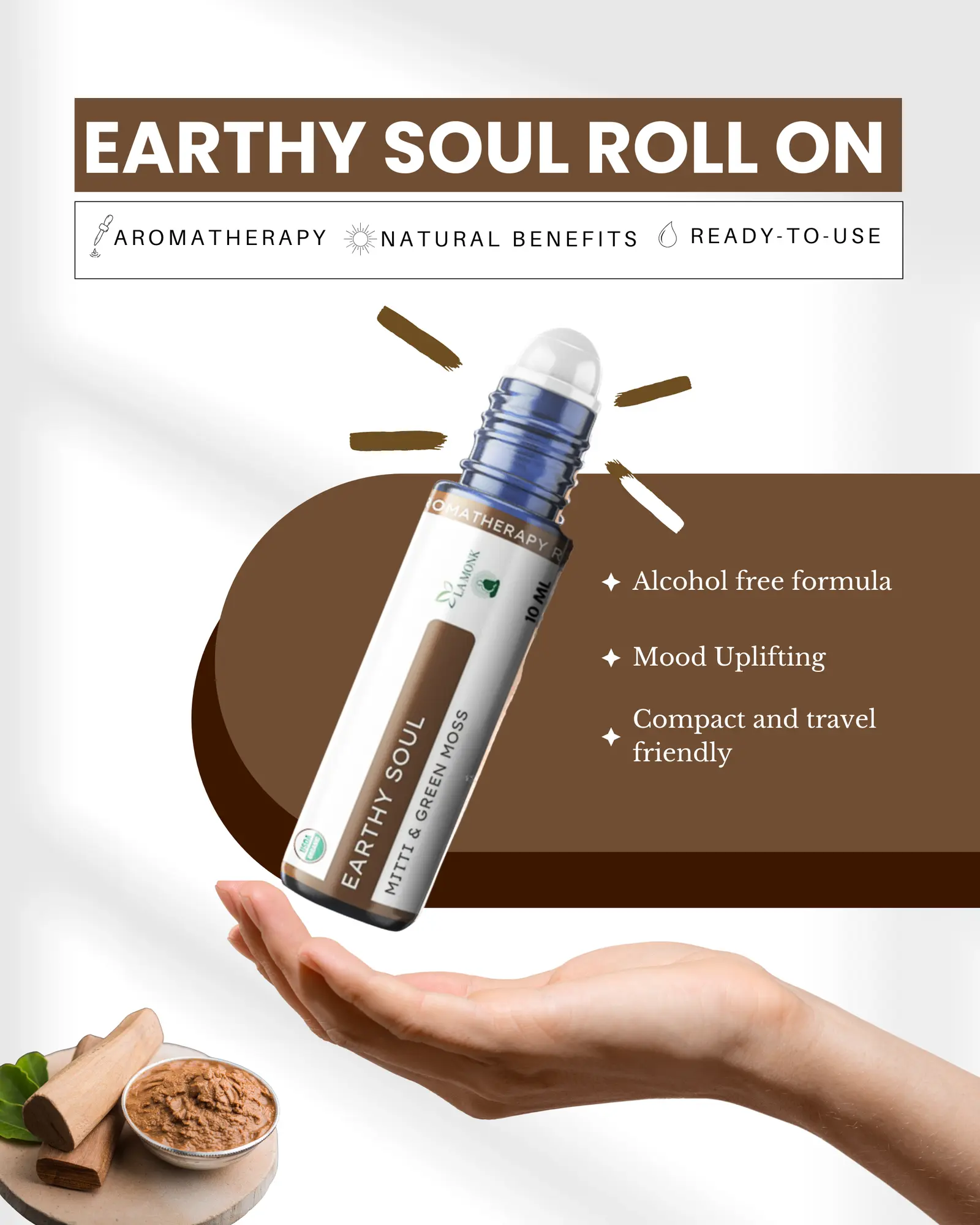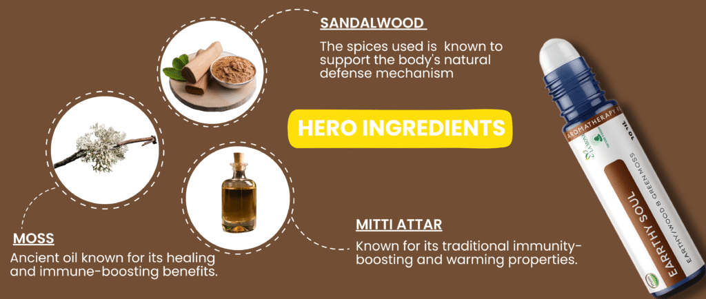 This Aromatherapy Roll-on is made by taking the theme of Wet Mud & Mossy Jungle splashed with rain, which gives you a feeling of being very close to God Nature. Its earthy aroma creates a deep-rooted sense of calm, like the fresh breath of air after monsoon showers. Designed for moments when you seek grounding, reflection, or reconnection with the natural world, this roll-on calms the senses and wraps you in the serenity of the forest.